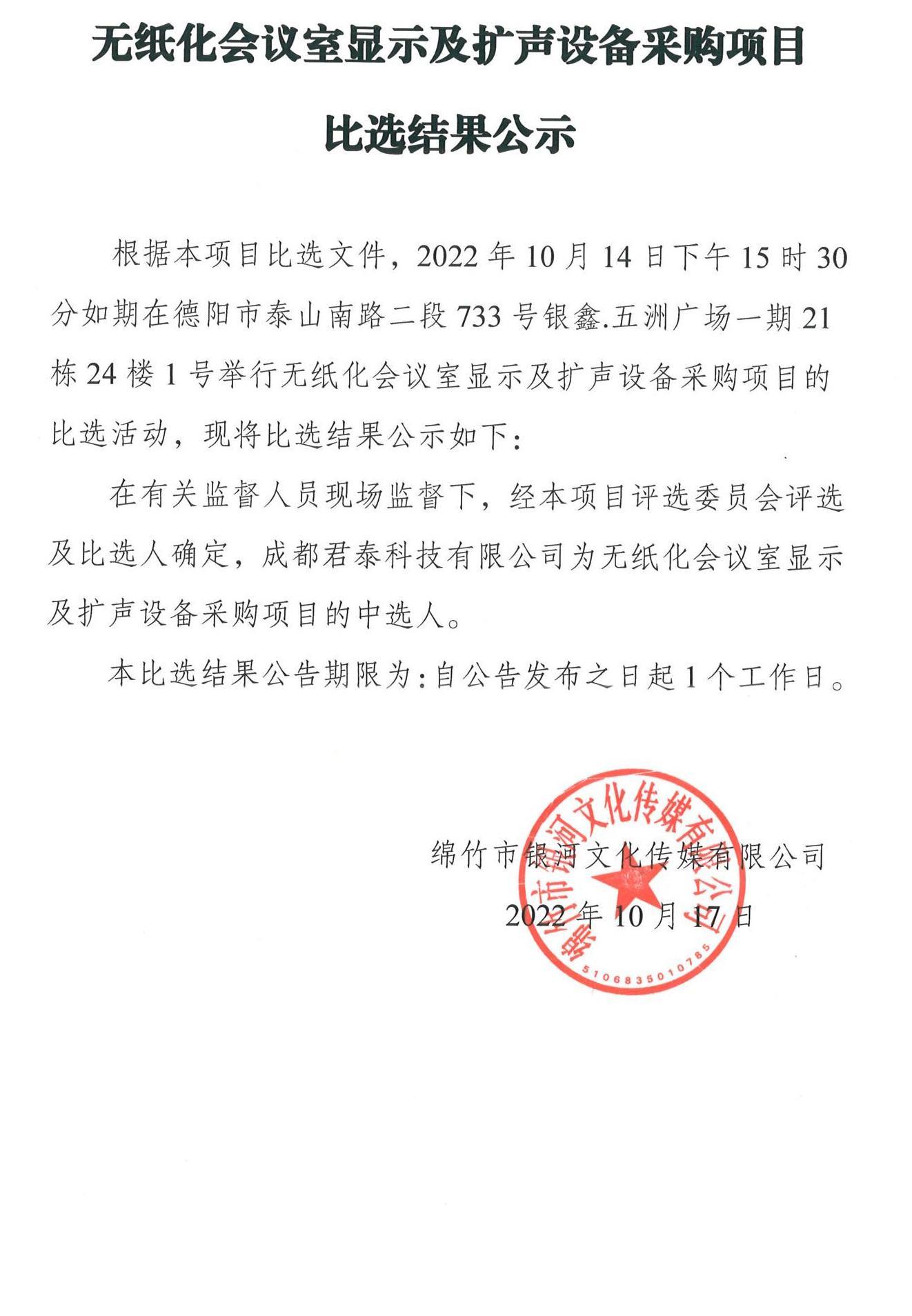 無(wú)紙化會(huì)議室顯示及擴(kuò)聲設(shè)備采購(gòu)項(xiàng)目比選結(jié)果公示