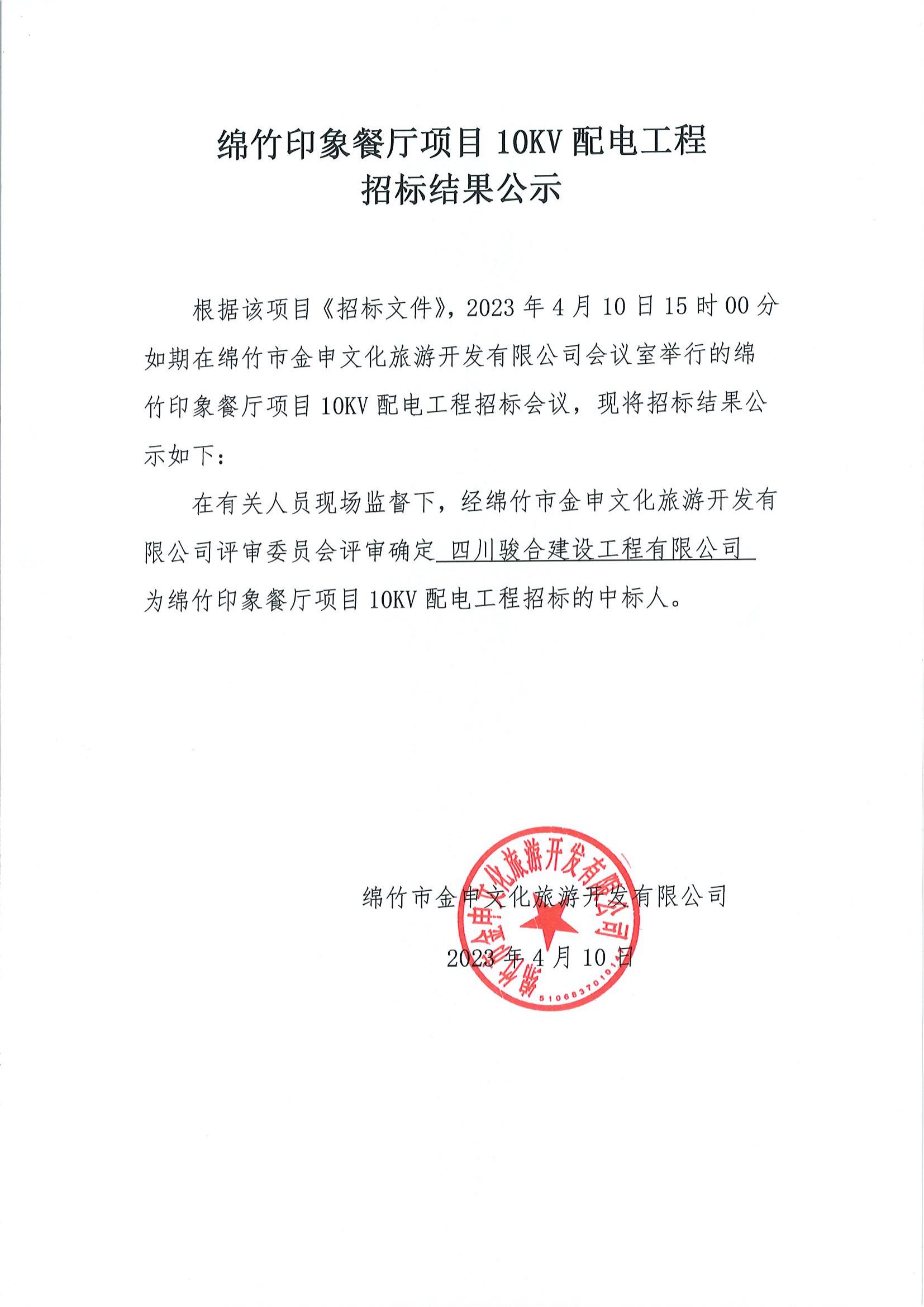 綿竹印象餐廳項(xiàng)目10KV配電工程招標(biāo)結(jié)果公示