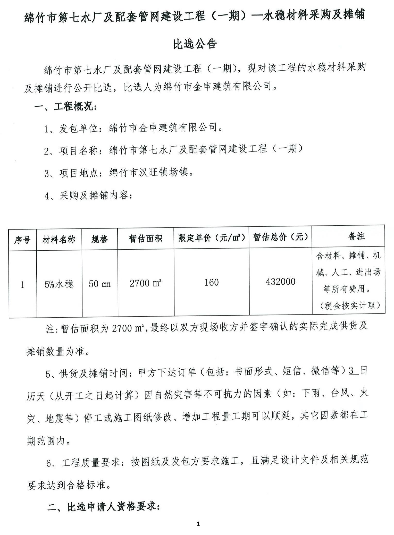 綿竹市第七水廠及配套管網(wǎng)建設(shè)項(xiàng)目水穩(wěn)材料采購(gòu)比選公告