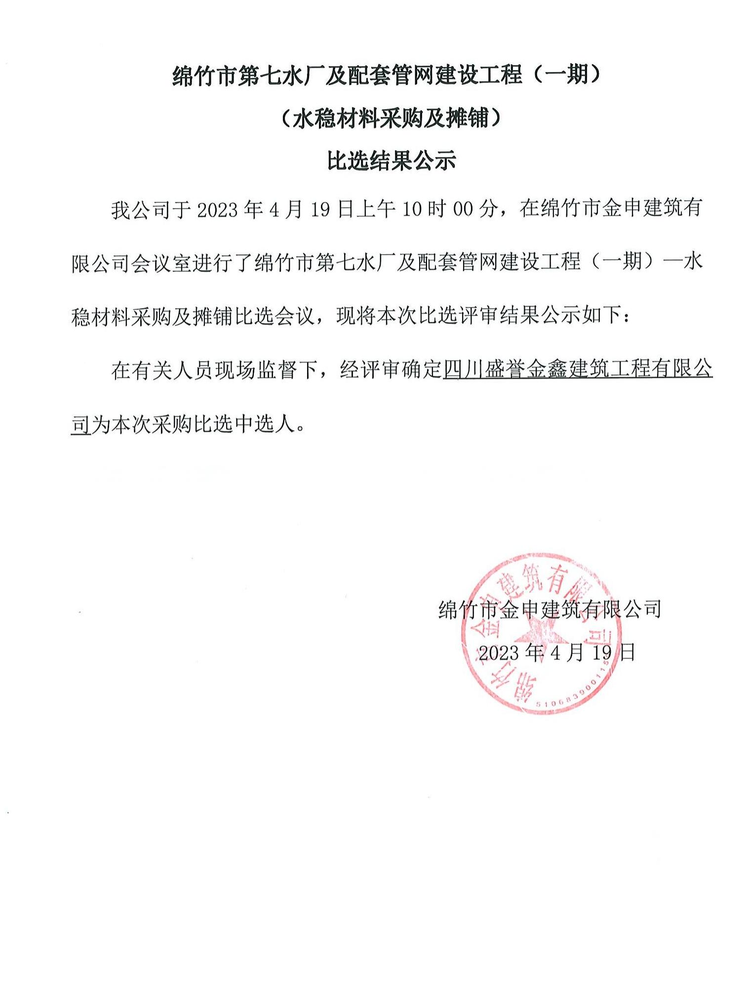 綿竹第七水廠配套管網(wǎng)建設(shè)項(xiàng)目水穩(wěn)材料采購(gòu)比選結(jié)果公示