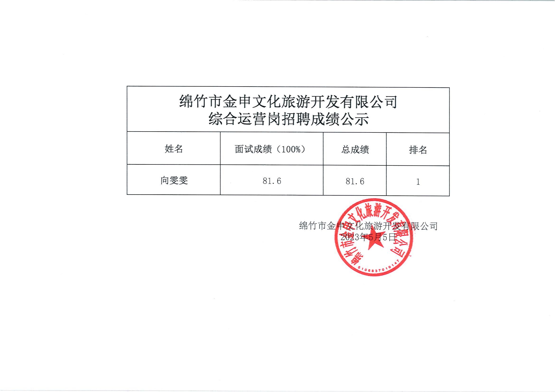 綿竹市金申文化旅游開發(fā)有限公司2023年招聘成績公示