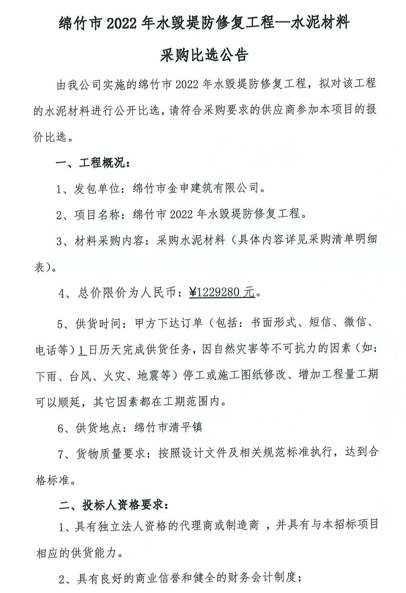 綿竹市2022年水毀堤防修復(fù)工程-水泥材料采購比選公告