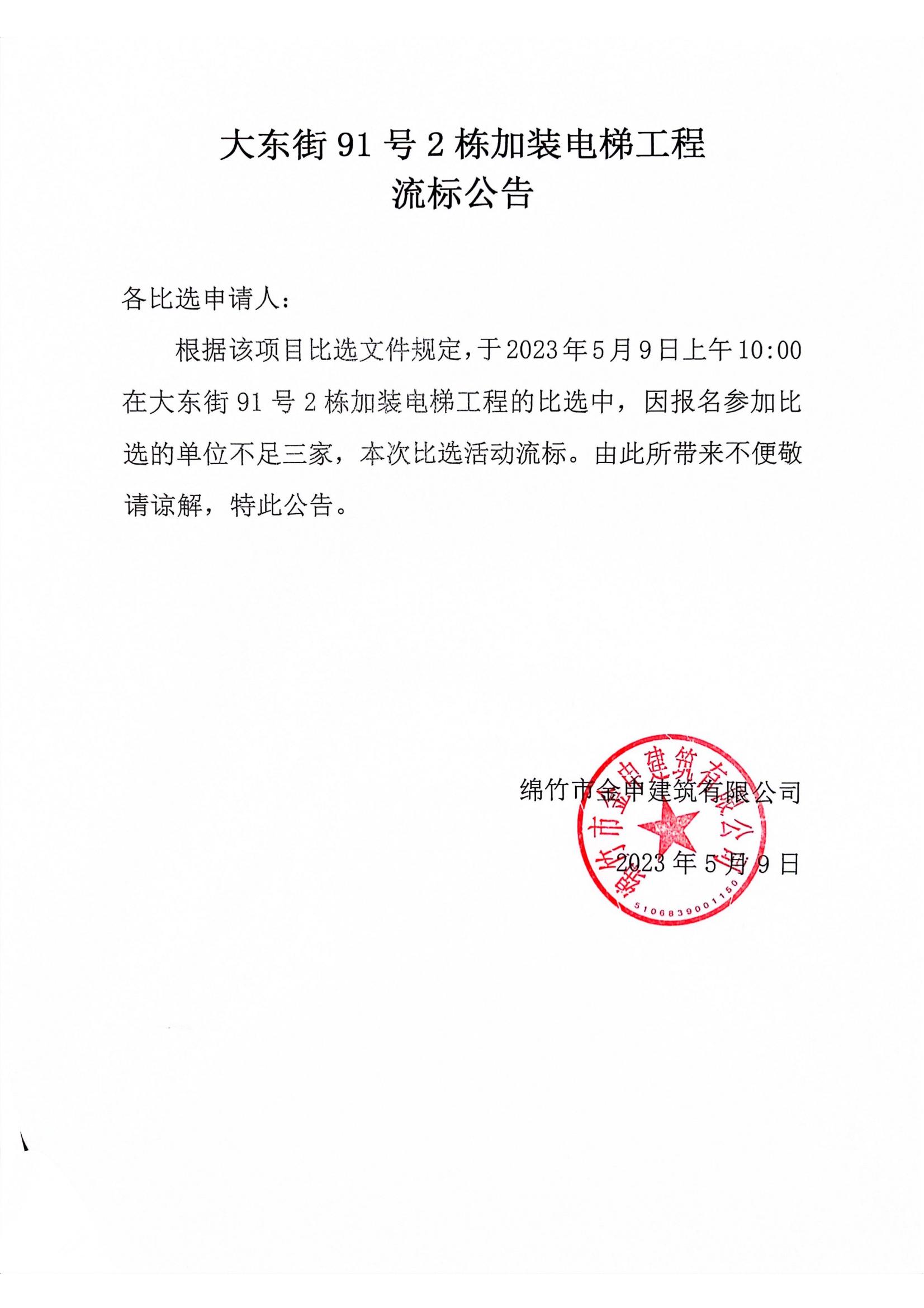 大東街91號2棟加裝電梯工程勞務(wù)分包流標(biāo)公告