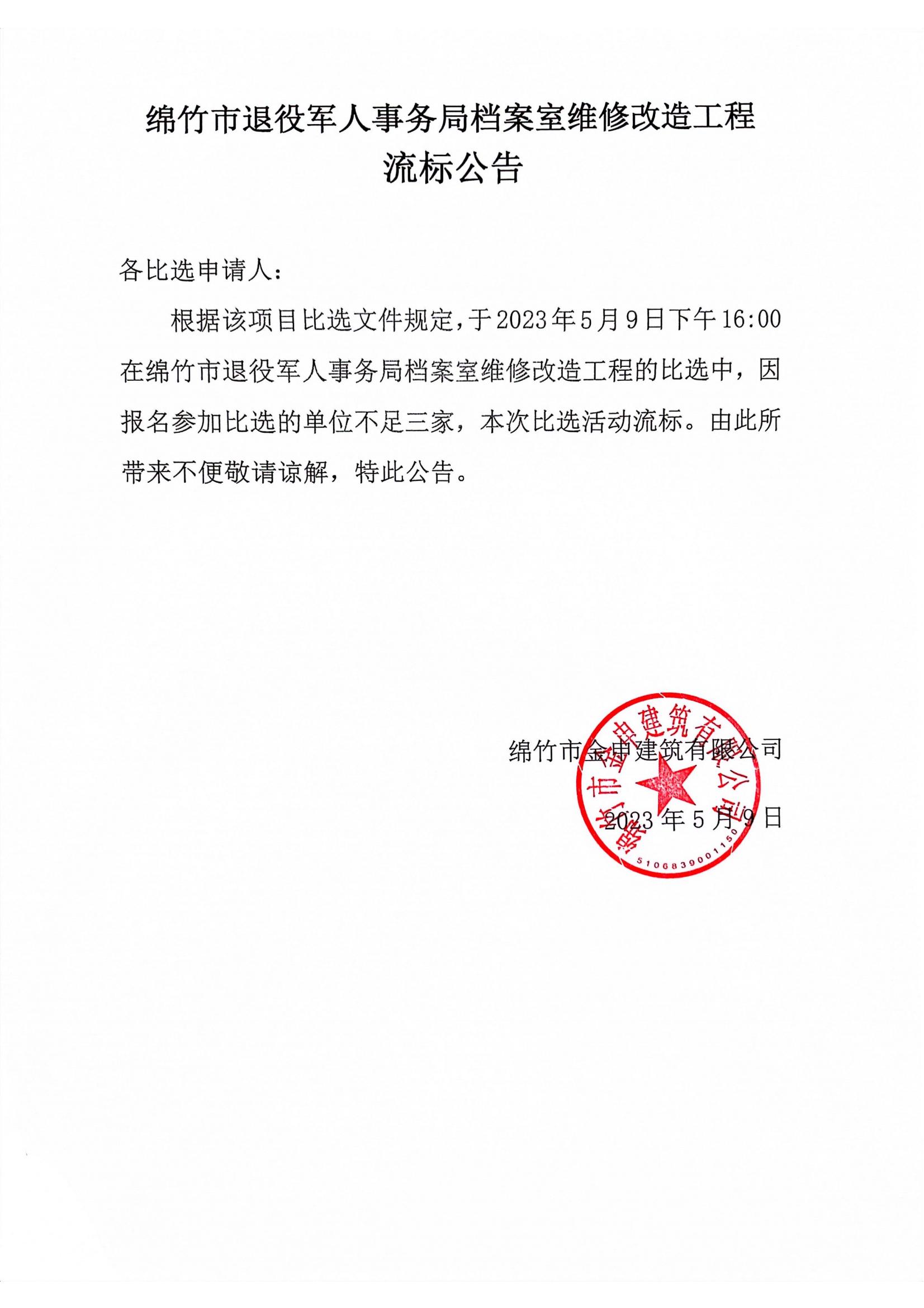 綿竹市退役軍人事務局檔案室維修改造勞務分包流標公告
