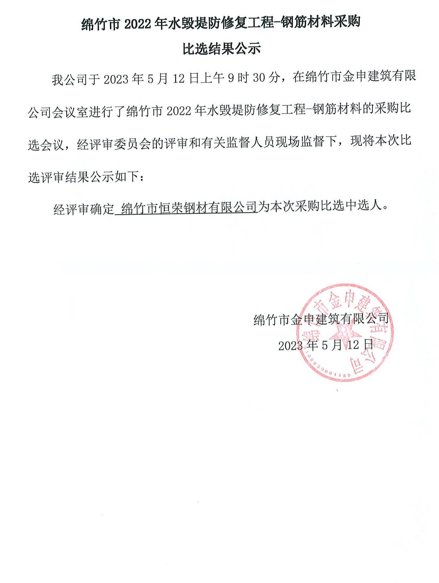 綿竹市2022年水毀堤防修復(fù)工程-鋼筋材料采購比選結(jié)果公示
