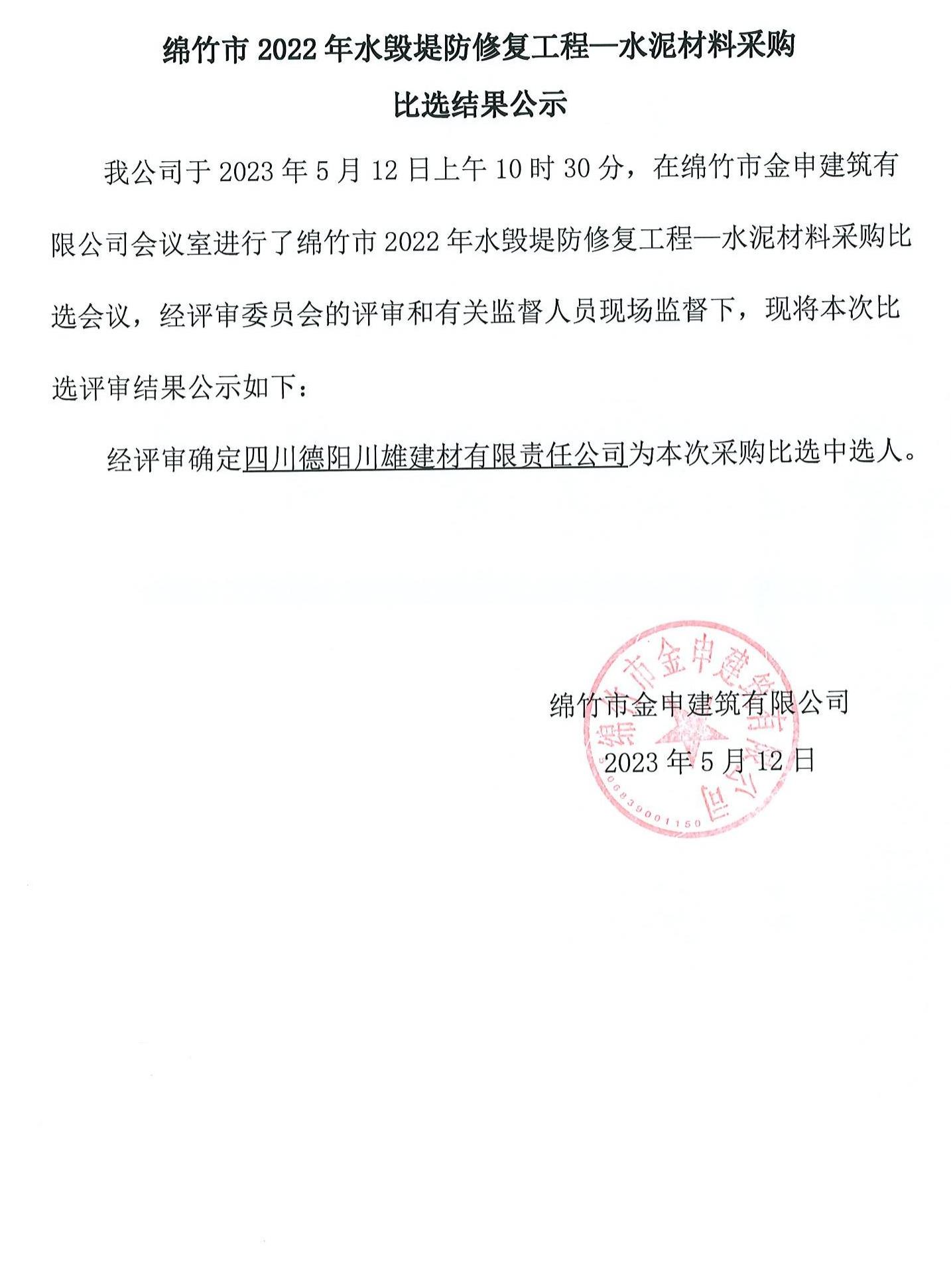 綿竹市2022年水毀堤防修復(fù)工程-水泥材料采購比選結(jié)果公告