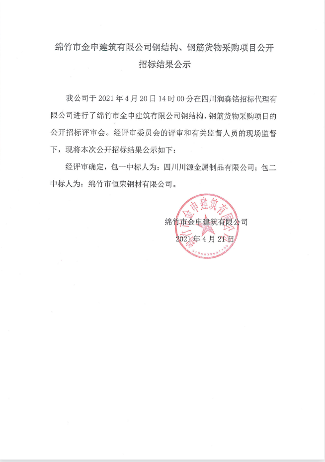 鋼結(jié)構(gòu)、鋼筋貨物采購項目招標結(jié)果公示
