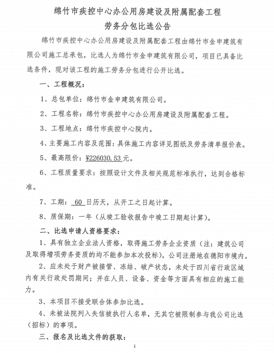 市疾控中心辦公用房建設及附屬配套工程勞務分包比選公告